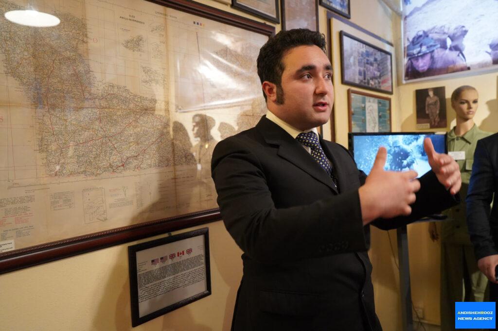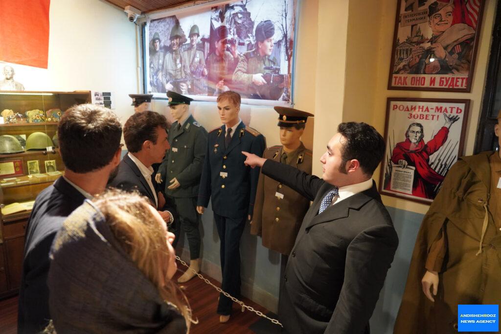 در ادامه مهمانان از بخش های مختلف موزه از جمله اتاق متفقین، اتاق آلمان، اتاق شوروی، اتاق ایران، کتابخانه، سالن نمایش فیلم و اتاق اسلحه بازدید کردند که در هر یک از این بخش ها، اسناد متنوعی شامل تصاویر تاریخی، مطبوعات قدیمی، اسناد مربوط به ایران در زمان اشغال، به علاوه ی لباس های نظامی، وسایل سربازان در جبهه نبرد، انواع سلاح قدیمی و بسیاری موارد دیگر در معرض تماشا قرار گرفته است.