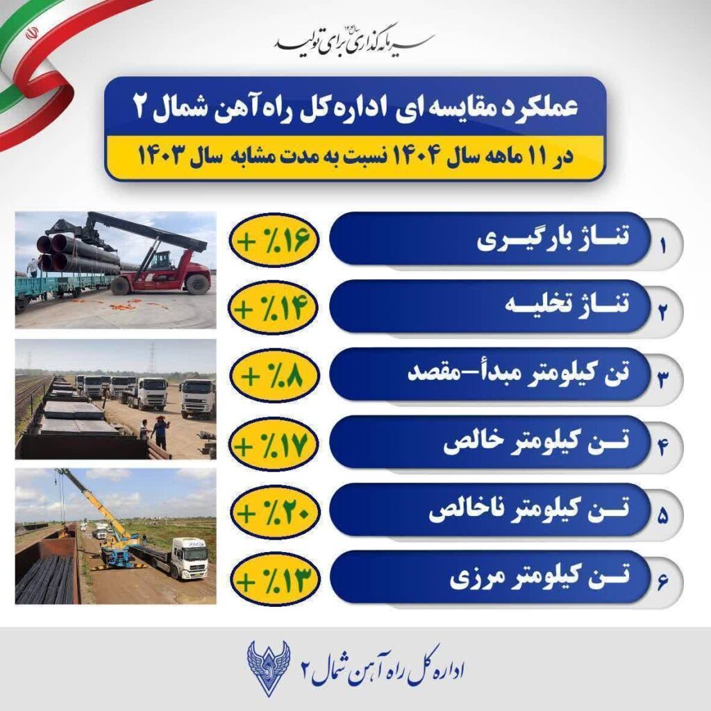 در سایر بخشهای حمل بار نیز شاخصها روندی صعودی داشتهاند؛ بهطوریکه تنکیلومتر مبدأ–مقصد با ۸ درصد رشد به ۱۷۶ میلیون، تنکیلومتر خالص با افزایش ۱۶ درصدی به ۲۴۲ میلیون، تنکیلومتر ناخالص با رشد ۲۰ درصدی به ۴۸۰ میلیون و تنکیلومتر مرزی با افزایش ۱۳ درصدی به ۳۶۰ میلیون تنکیلومتر رسیده است.