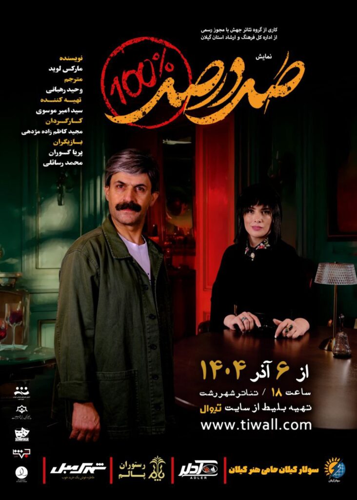 اندیشه تازه ؛ نمایش «صد درصد» به نویسندگی مارکس لوید و با ترجمه وحید رهبانی از تاریخ ۶ آذر ۱۴۰۴ در تئاتر شهر رشت روی صحنه میرود. این اثر نمایشی که در ژانر تریلر روانشناسی قرار دارد، به تهیهکنندگی سید امیر موسوی و کارگردانی مجید کاظمزاده مژدهی تولید شده است.
